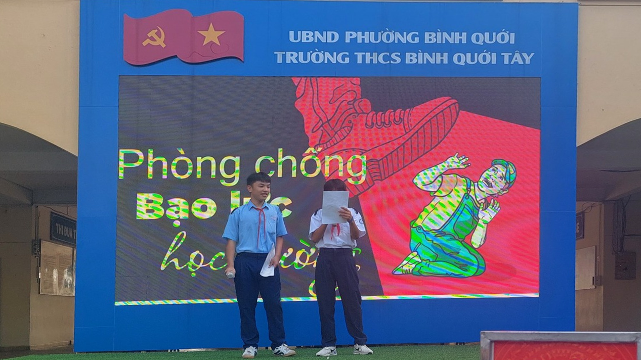 Các bạn lớp 8.1 ghép 2 tiết mục văn nghệ, 1 bài hát tiếng,anh và 1 bài hát ca ngợi mái trường Bình Quới Tây. Các bạn giúp chúng ta nhận biết các dấu hiệu bạo lực học đường.